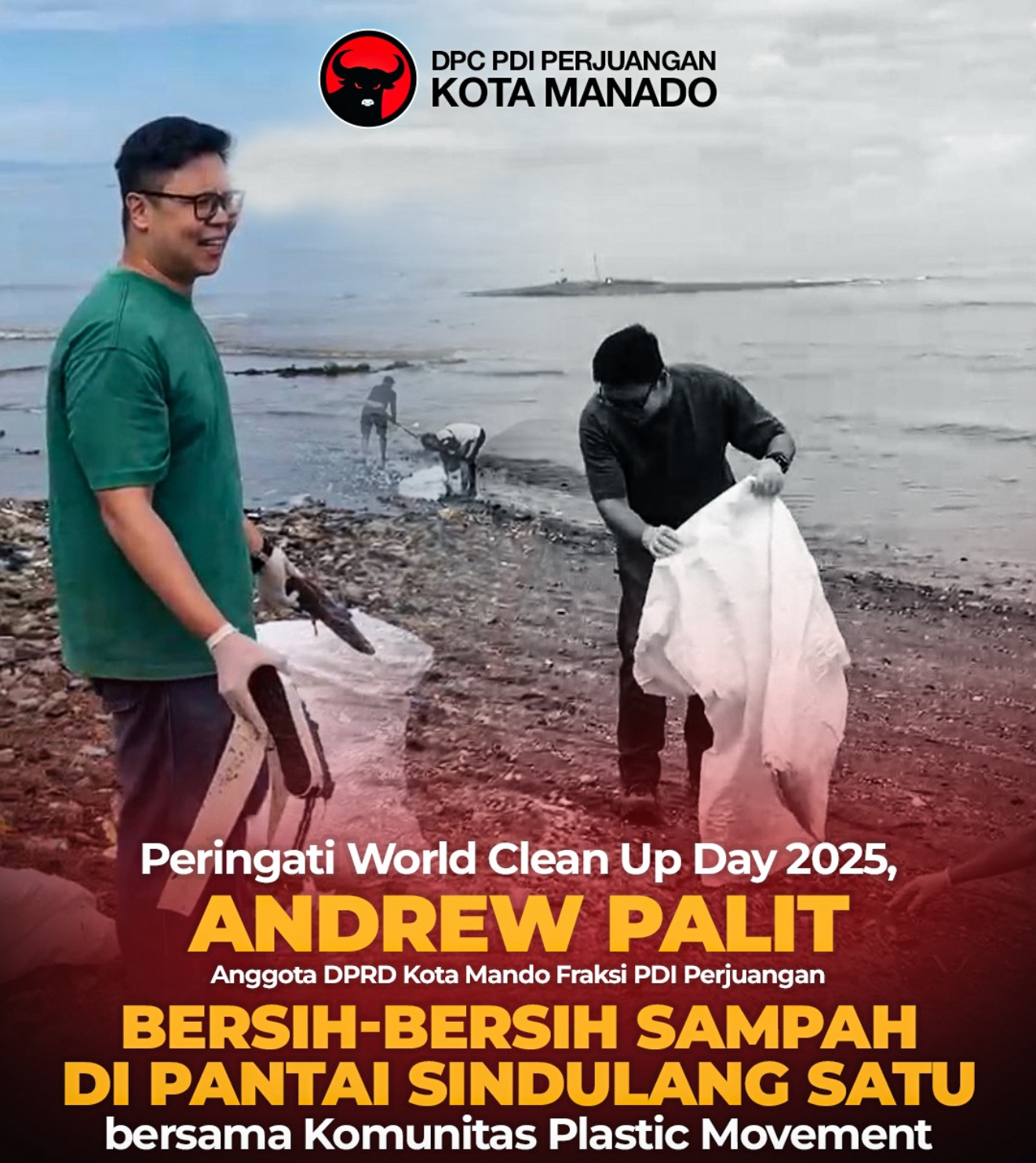 Anggota DPRD Kota Manado dari Fraksi PDI Perjuangan, Andrei Palit, turut ambil bagian dalam peringatan World Clean Up Day 2025 bersama komunitas Plastic Movement, Minggu (22/09/2025).