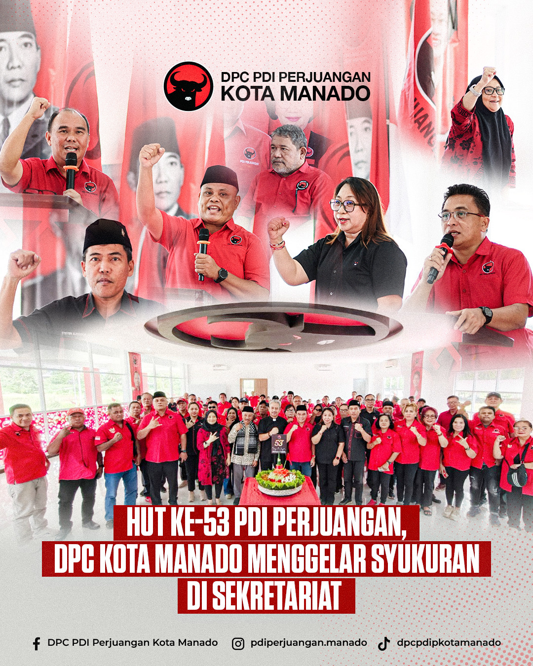Memperingati HUT ke-53 PDI Perjuangan, DPC Kota Manado menggelar syukuran di Sekretariat Jalan Ring Road, Mapanget, Sabtu (10/1/2026). Hadir bersama kader dan simpatisan, seluruh jajaran pengurus merayakan dan memeriahkan syukuran ini.